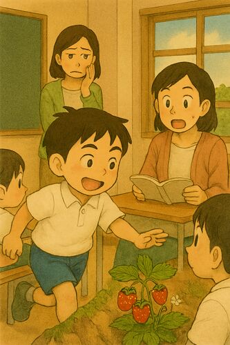 小学校低学年の時だと思う 家の裏には 小高い丘に続く農道があり、下側には用水路が流れていた 側面は石垣で整えられていた その石垣を覆うように イチゴの木が生えていた そのイチゴは山イチゴだったと思うが その赤い実は甘酸っぱくて まことに美味しいも…
